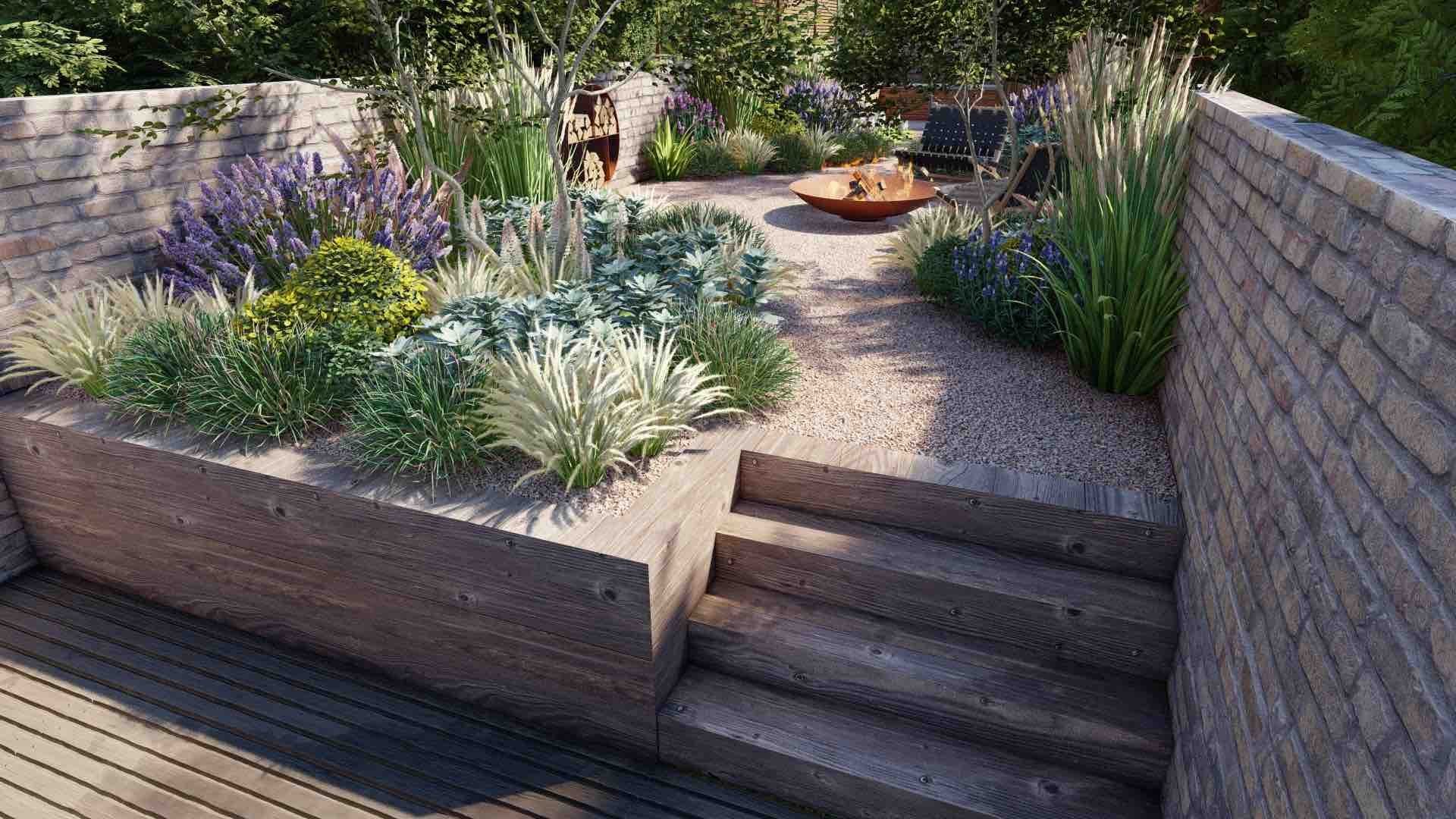 A fire bowl and wood store are features on this dry garden inspired by river beds in summer.