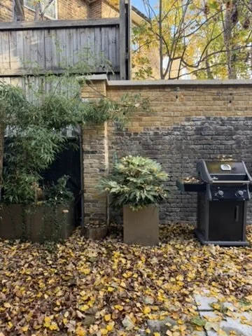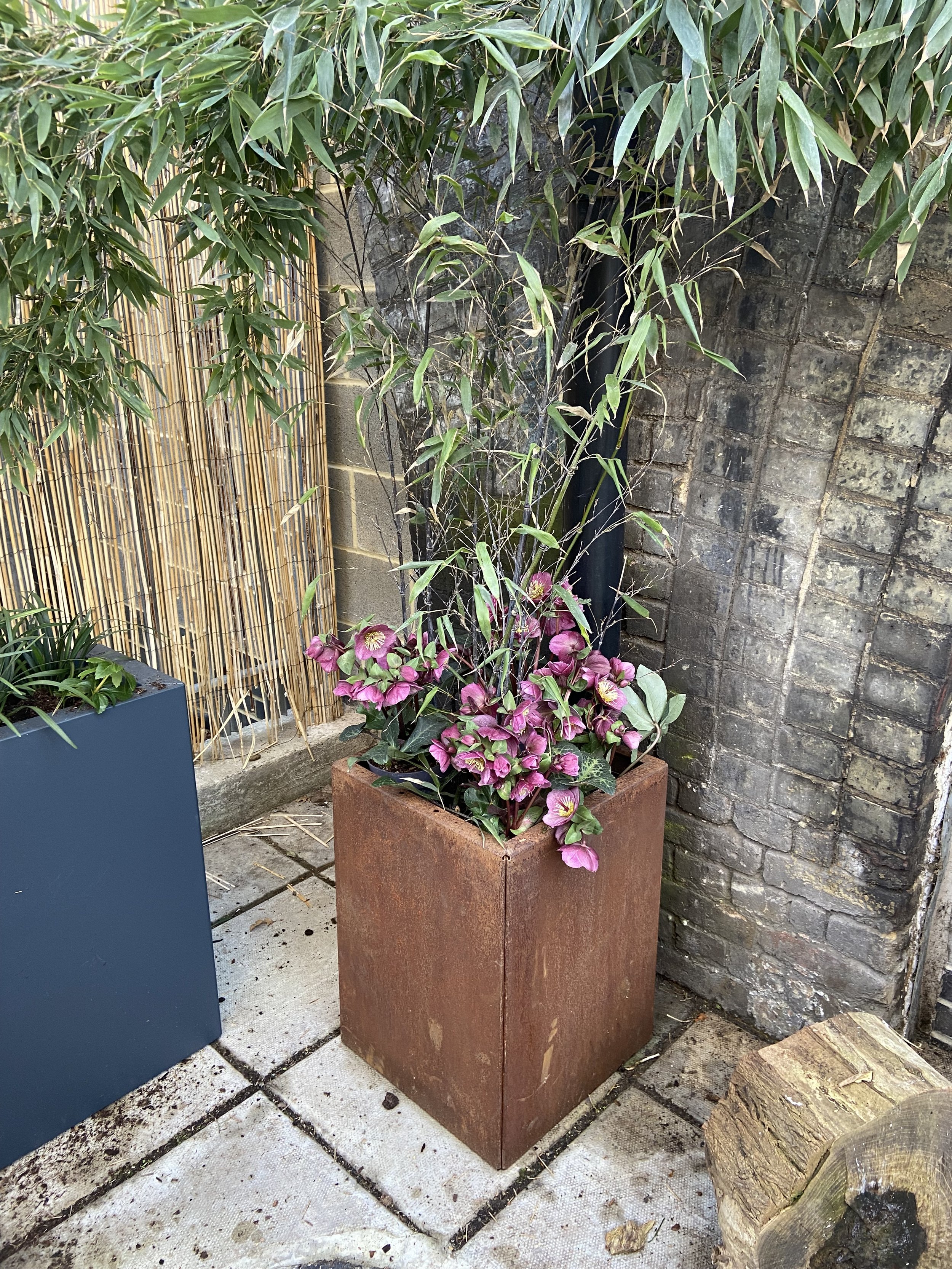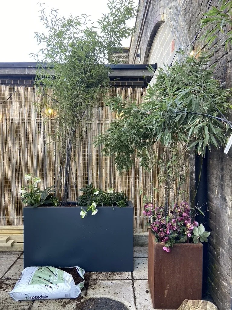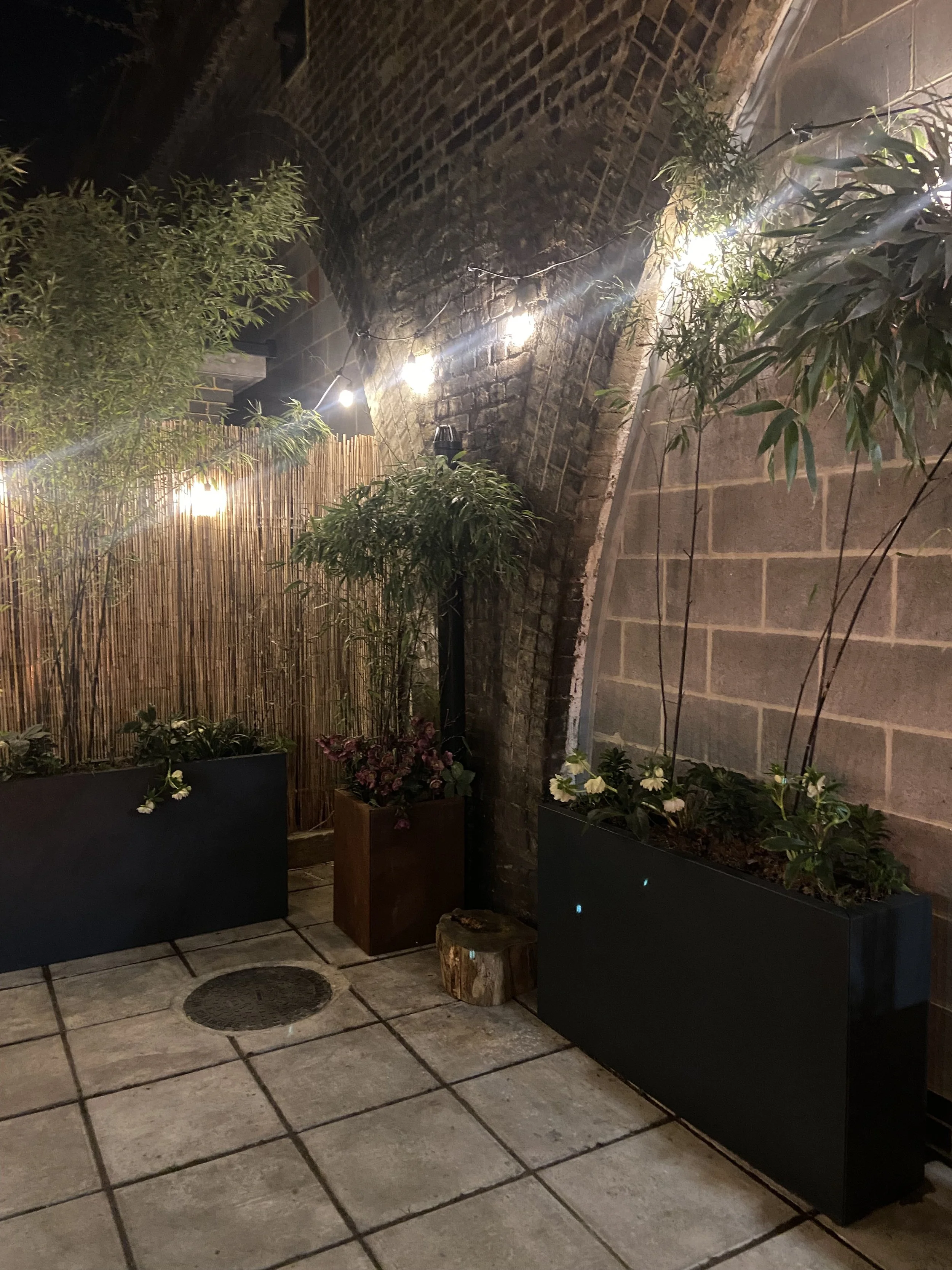 The industrial brick and concrete space under railway arches is complemented by planters in anthracite, gold and rust with evergreen plants and seasonal colour.